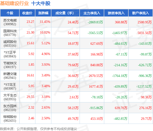 个股表现方面,基础建设行业当日领涨股为苏文电能(300982),该股当日报收23.27,上涨11.45%,成交量24.4万,主力资金净流出2869.83万元。国晟科技(603778)以上涨10.02%紧随其后,该股当日成交量54.72万,主力资金净流出3565.53万元。除此之外,诚邦股份(603316)、*ST正平(603843)、节能铁汉(300197)均进入当日牛股之列。具体个股列表见下表: