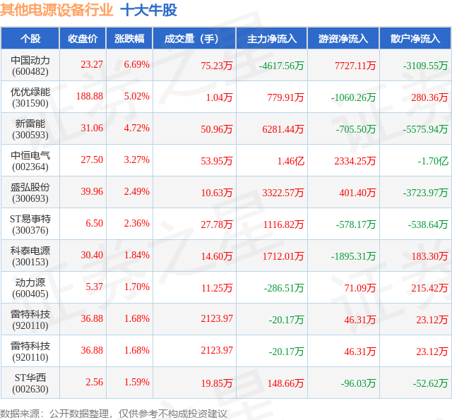 个股表现方面,其他电源设备行业当日领涨股为中国动力(600482),该股当日报收23.27,上涨6.69%,成交量75.23万,主力资金净流出4617.56万元。优优绿能(301590)以上涨5.02%紧随其后,该股当日成交量1.04万,主力资金净流入779.91万元。除此之外,新雷能(300593)、中恒电气(002364)、盛弘股份(300693)均进入当日牛股之列。具体个股列表见下表: