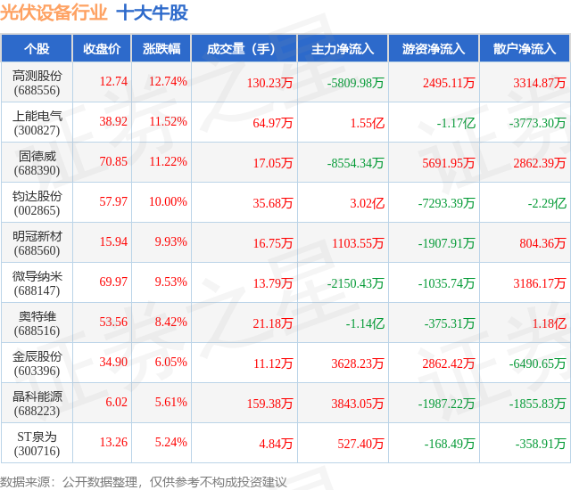 个股表现方面,光伏设备行业当日领涨股为高测股份(688556),该股当日报收12.74,上涨12.74%,成交量130.23万,主力资金净流出5809.98万元。上能电气(300827)以上涨11.52%紧随其后,该股当日成交量64.97万,主力资金净流入1.55亿元。除此之外,固德威(688390)、钧达股份(002865)、明冠新材(688560)均进入当日牛股之列。具体个股列表见下表: