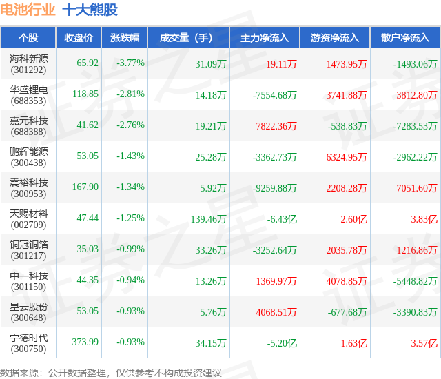 个股表现方面,电池行业当日领跌股为海科新源(301292),该股当日报收65.92,下跌3.77%,成交量31.09万,主力资金净流入19.11万元。华盛锂电(688353)以下跌2.81%紧随其后,该股当日成交量14.18万,主力资金净流出7554.68万元。除此之外,嘉元科技(688388)、鹏辉能源(300438)、震裕科技(300953)均进入当日熊股之列。具体个股列表见下表:
