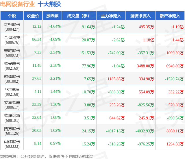 个股表现方面,电网设备行业当日领跌股为红相股份(300427),该股当日报收12.12,下跌4.64%,成交量91.64万,主力资金净流出1.24亿元。金盘科技(688676)以下跌4.09%紧随其后,该股当日成交量20.87万,主力资金净流出2.62亿元。除此之外,宝胜股份(600973)、智光电气(002169)、崧盛股份(301002)均进入当日熊股之列。具体个股列表见下表: