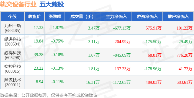 个股表现方面,轨交设备行业当日领跌股为九州一轨(688485),该股当日报收17.32,下跌1.87%,成交量3.47万,主力资金净流出677.13万元。朗进科技(300594)以下跌0.75%紧随其后,该股当日成交量3.11万,主力资金净流入204.99万元。除此之外,必得科技(605298)、交控科技(688015)、鼎汉技术(300011)均进入当日熊股之列。具体个股列表见下表: