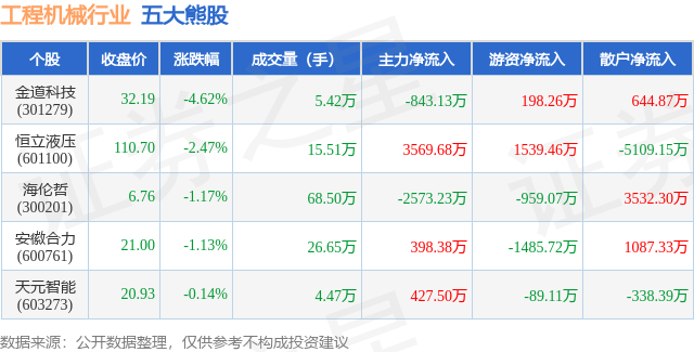 个股表现方面,工程机械行业当日领跌股为金道科技(301279),该股当日报收32.19,下跌4.62%,成交量5.42万,主力资金净流出843.13万元。恒立液压(601100)以下跌2.47%紧随其后,该股当日成交量15.51万,主力资金净流入3569.68万元。除此之外,海伦哲(300201)、安徽合力(600761)、天元智能(603273)均进入当日熊股之列。具体个股列表见下表: