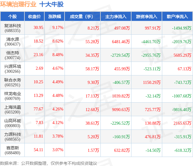 个股表现方面,环境治理行业当日领涨股为复洁科技(688335),该股当日报收30.95,上涨9.17%,成交量8.21万,主力资金净流入497.08万元。清水源(300437)以上涨8.62%紧随其后,该股当日成交量55.28万,主力资金净流入6481.46万元。除此之外,倍杰特(300774)、兴源环境(300266)、联合水务(603291)均进入当日牛股之列。具体个股列表见下表: