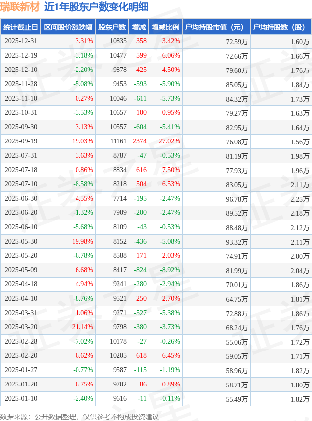 从股价来看,2025年12月19日至2025年12月31日,瑞联新材区间涨幅为3.31%,在此期间股东户数增加358.0户,增幅为3.42%。