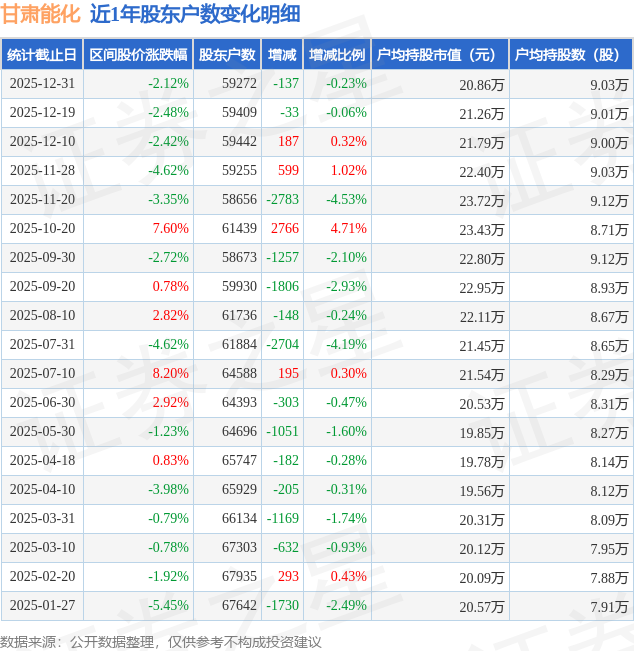从股价来看,2025年12月19日至2025年12月31日,甘肃能化区间跌幅为2.12%,在此期间股东户数减少137.0户,减幅为0.23%。