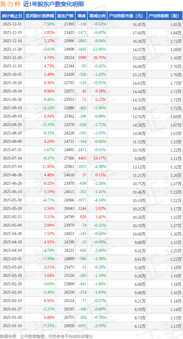 从股价来看,2025年12月19日至2025年12月31日,英 力 特区间跌幅为7.59%,在此期间股东户数减少130.0户,减幅为0.61%。