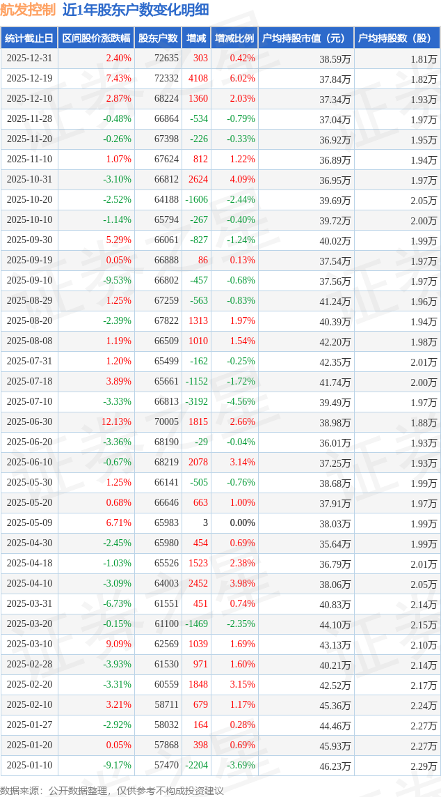 从股价来看,2025年12月19日至2025年12月31日,航发控制区间涨幅为2.4%,在此期间股东户数增加303.0户,增幅为0.42%。