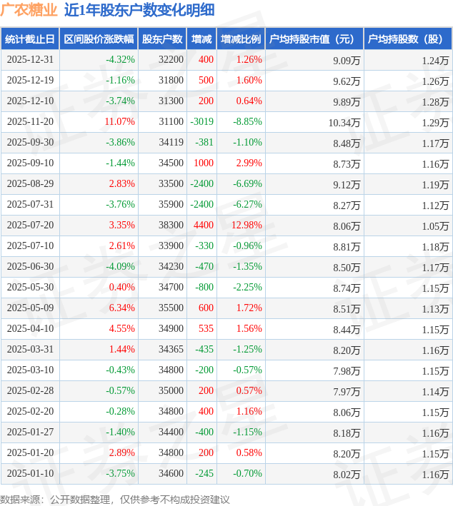 从股价来看,2025年12月19日至2025年12月31日,广农糖业区间跌幅为4.32%,在此期间股东户数增加400.0户,增幅为1.26%。