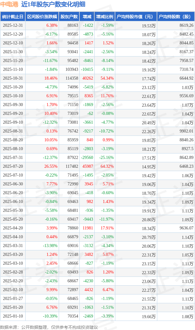 从股价来看,2025年12月20日至2025年12月31日,中电港区间涨幅为6.38%,在此期间股东户数减少1422.0户,减幅为1.59%。