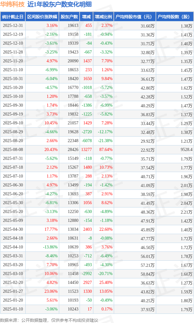 从股价来看,2025年12月19日至2025年12月31日,华纬科技区间涨幅为3.16%,在此期间股东户数增加455.0户,增幅为2.37%。