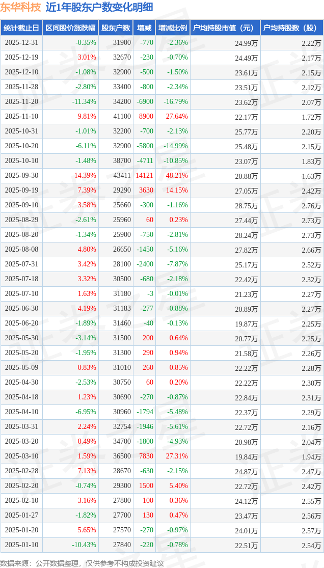 从股价来看,2025年12月19日至2025年12月31日,东华科技区间跌幅为0.35%,在此期间股东户数减少770.0户,减幅为2.36%。