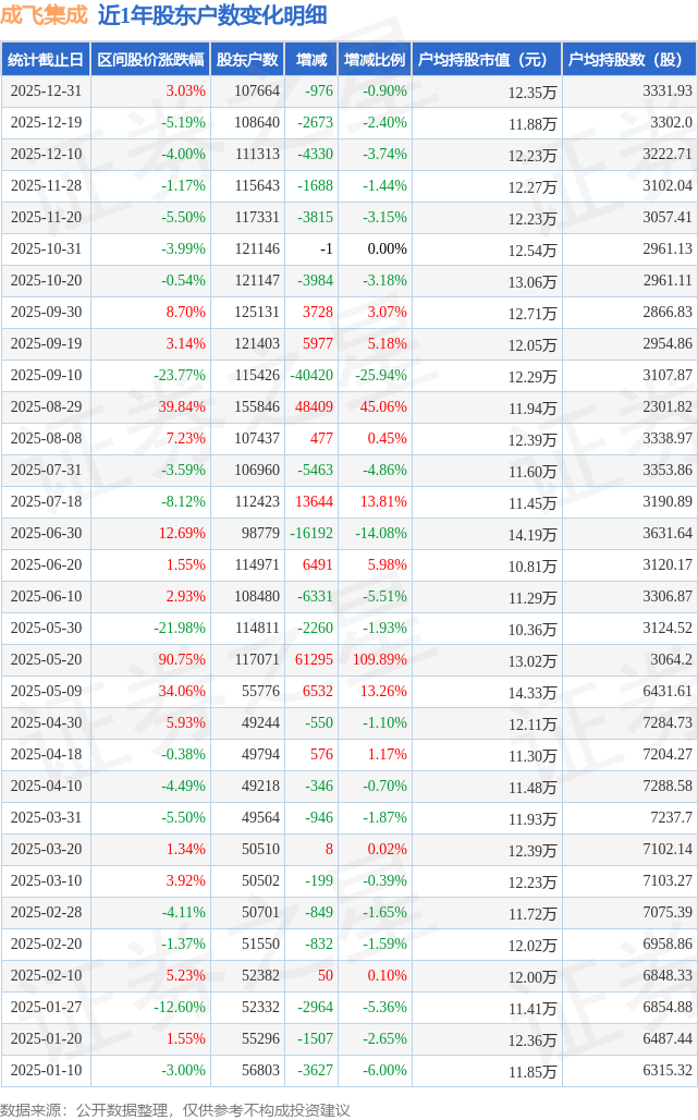 从股价来看,2025年12月19日至2025年12月31日,成飞集成区间涨幅为3.03%,在此期间股东户数减少976.0户,减幅为0.9%。