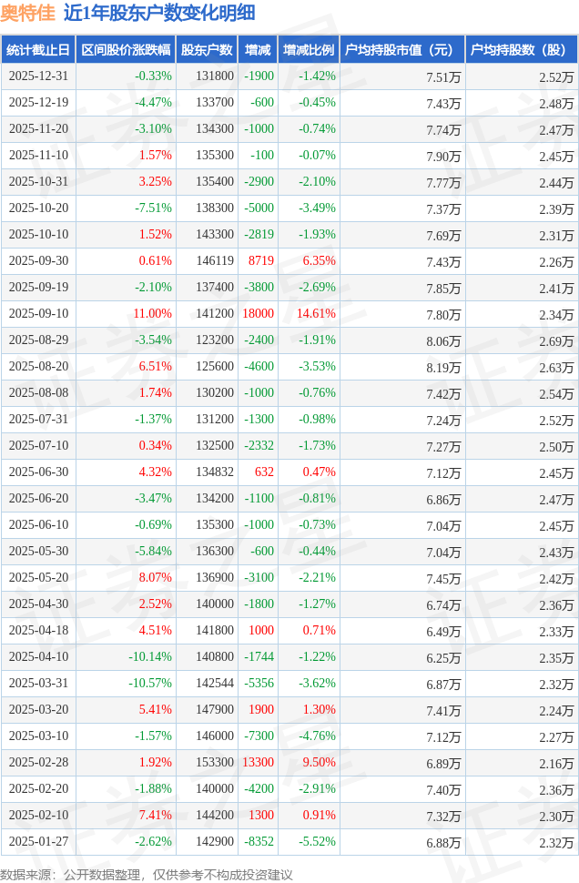 从股价来看,2025年12月19日至2025年12月31日,奥特佳区间跌幅为0.33%,在此期间股东户数减少1900.0户,减幅为1.42%。