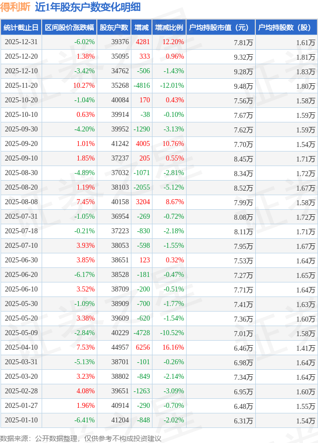 从股价来看,2025年12月20日至2025年12月31日,得利斯区间跌幅为6.02%,在此期间股东户数增加4281.0户,增幅为12.2%。