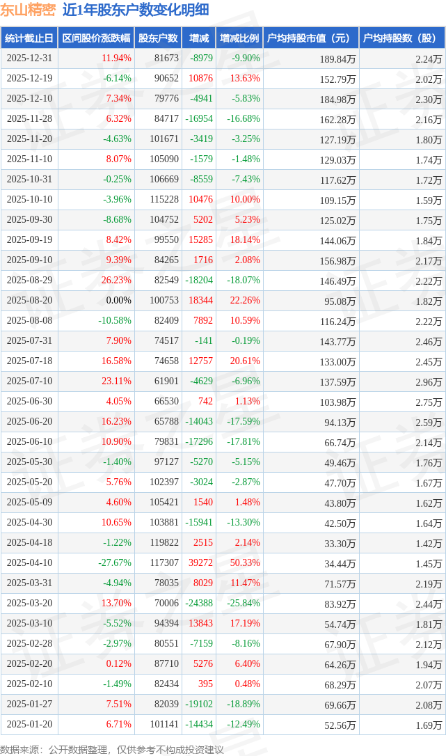 从股价来看,2025年12月19日至2025年12月31日,东山精密区间涨幅为11.94%,在此期间股东户数减少8979.0户,减幅为9.9%。