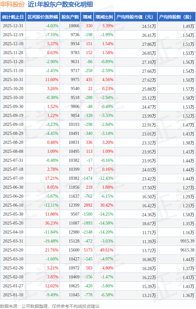 从股价来看,2025年12月19日至2025年12月31日,申科股份区间跌幅为4.03%,在此期间股东户数增加330.0户,增幅为3.39%。