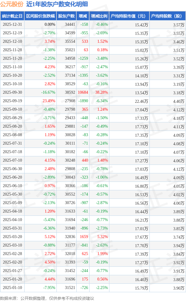 从股价来看,2025年12月19日至2025年12月31日,公元股份区间跌幅为0.0%,在此期间股东户数减少158.0户,减幅为0.46%。
