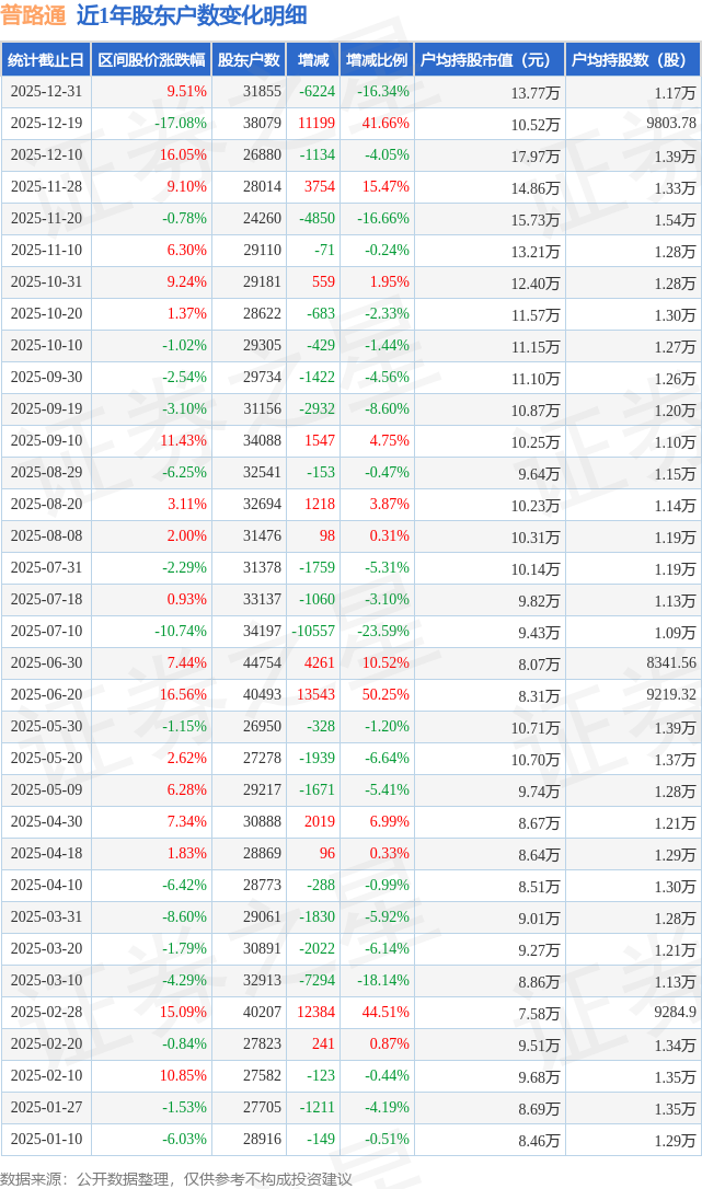 从股价来看,2025年12月19日至2025年12月31日,普路通区间涨幅为9.51%,在此期间股东户数减少6224.0户,减幅为16.34%。