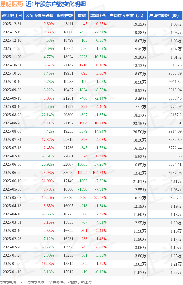 从股价来看,2025年12月19日至2025年12月31日,易明医药区间涨幅为0.6%,在此期间股东户数增加45.0户,增幅为0.25%。