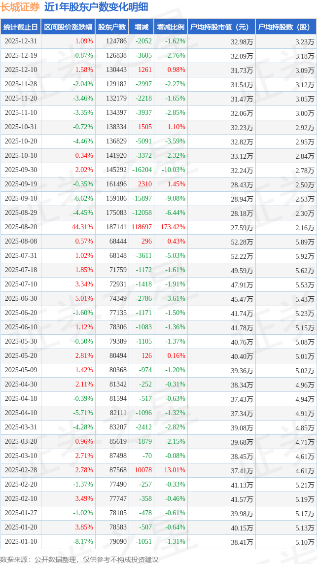 从股价来看,2025年12月19日至2025年12月31日,长城证券区间涨幅为1.09%,在此期间股东户数减少2052.0户,减幅为1.62%。