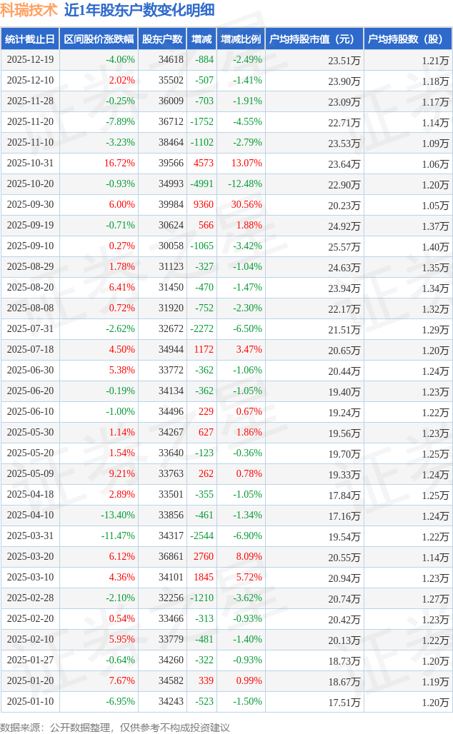从股价来看,2025年12月10日至2025年12月19日,科瑞技术区间跌幅为4.06%,在此期间股东户数减少884.0户,减幅为2.49%。