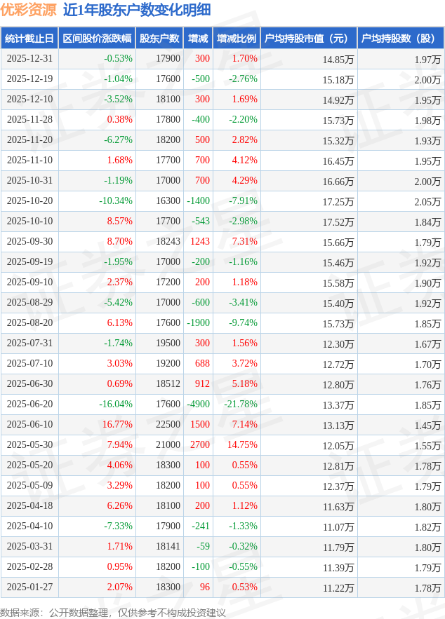 从股价来看,2025年12月19日至2025年12月31日,优彩资源区间跌幅为0.53%,在此期间股东户数增加300.0户,增幅为1.7%。