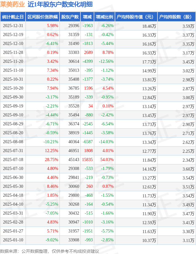 从股价来看,2025年12月19日至2025年12月31日,莱美药业区间涨幅为5.98%,在此期间股东户数减少1963.0户,减幅为6.26%。