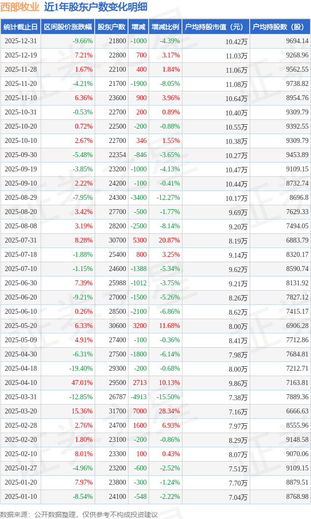从股价来看,2025年12月19日至2025年12月31日,西部牧业区间跌幅为9.66%,在此期间股东户数减少1000.0户,减幅为4.39%。