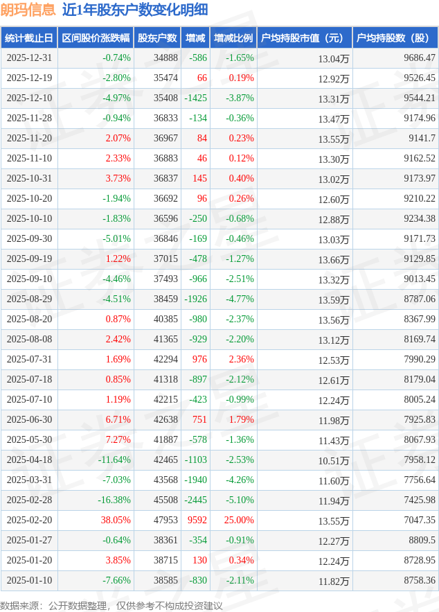 从股价来看,2025年12月19日至2025年12月31日,朗玛信息区间跌幅为0.74%,在此期间股东户数减少586.0户,减幅为1.65%。