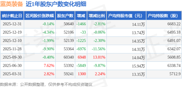 从股价来看,2025年12月19日至2025年12月31日,蓝英装备区间跌幅为0.14%,在此期间股东户数减少1466.0户,减幅为2.81%。