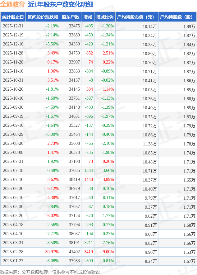 从股价来看,2025年12月19日至2025年12月31日,全通教育区间跌幅为2.19%,在此期间股东户数减少405.0户,减幅为1.2%。