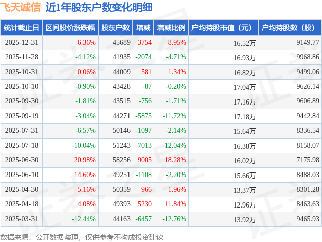 从股价来看,2025年11月28日至2025年12月31日,飞天诚信区间涨幅为6.36%,在此期间股东户数增加3754.0户,增幅为8.95%。