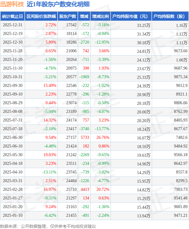 从股价来看,2025年12月19日至2025年12月31日,迅游科技区间涨幅为2.72%,在此期间股东户数减少572.0户,减幅为3.16%。