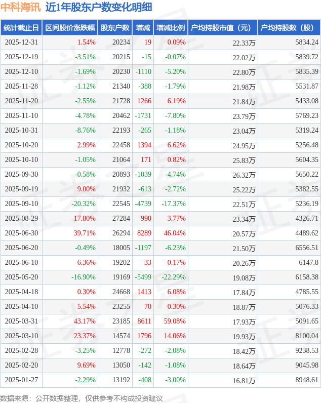 从股价来看,2025年12月19日至2025年12月31日,中科海讯区间涨幅为1.54%,在此期间股东户数增加19.0户,增幅为0.09%。