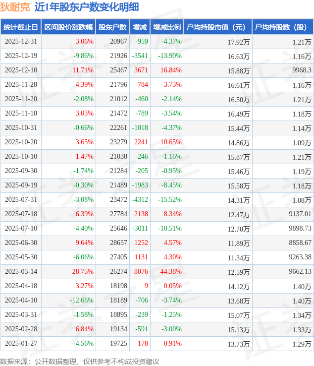 从股价来看,2025年12月19日至2025年12月31日,狄耐克区间涨幅为3.06%,在此期间股东户数减少959.0户,减幅为4.37%。