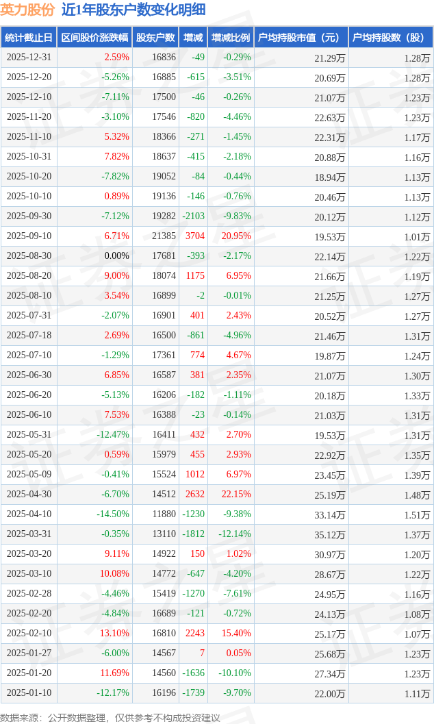 从股价来看,2025年12月20日至2025年12月31日,英力股份区间涨幅为2.59%,在此期间股东户数减少49.0户,减幅为0.29%。