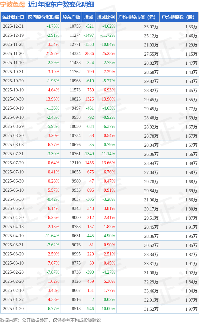 从股价来看,2025年12月19日至2025年12月31日,宁波色母区间跌幅为4.75%,在此期间股东户数减少521.0户,减幅为4.62%。