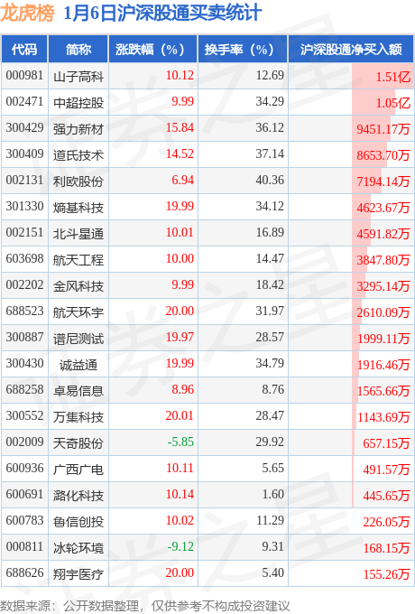 龙虎榜中有沪股通/深股通专用席位(北向资金)现身的个股共37家,其中山子高科以净买入1.51亿元排名第一。详情见下表: