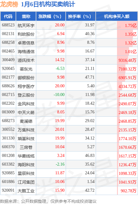 当日公布的交易所龙虎榜中有机构专用席位现身的个股共36家,其中航天环宇以净买入1.75亿元排名第一。详情见下表: