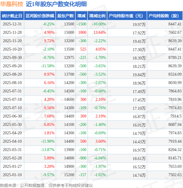 从股价来看,2025年12月20日至2025年12月31日,华是科技区间跌幅为0.25%,在此期间股东户数减少1500.0户,减幅为10.0%。