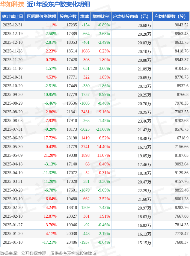 从股价来看,2025年12月19日至2025年12月31日,华如科技区间涨幅为1.11%,在此期间股东户数减少154.0户,减幅为0.89%。