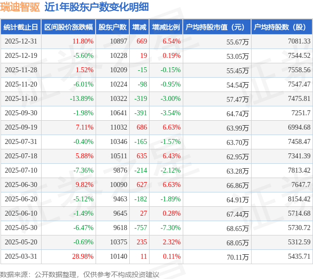从股价来看,2025年12月19日至2025年12月31日,瑞迪智驱区间涨幅为11.8%,在此期间股东户数增加669.0户,增幅为6.54%。