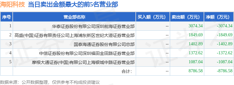证券之星消息,沪深交易所2026年1月6日公布的交易公开信息显示,海阳科技(603382)因有价格涨跌幅限制的日换手率达到20%的前五只证券登上龙虎榜。此次是近5个交易日内第2次上榜。