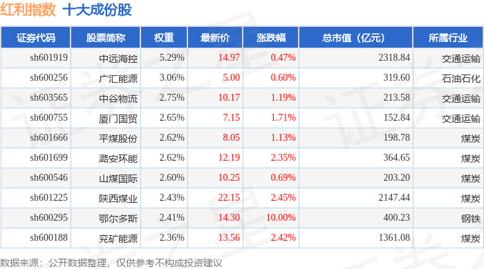 证券之星消息,1月6日,红利指数(000015)报收于3071.85点,涨1.17%,成交399.85亿元,换手率0.29%。当日该指数成份股中,上涨的有38家,鄂尔多斯以10.0%的涨幅领涨,下跌的有12家,山东高速以2.18%的跌幅领跌。