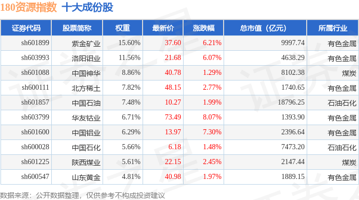 180资源(000026)指数十大成份股详情如下: