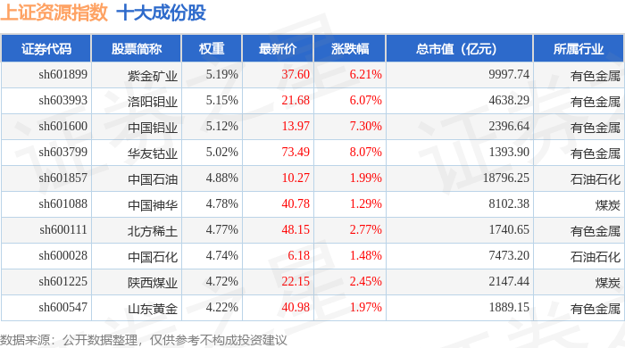 上证资源(000068)指数十大成份股详情如下: