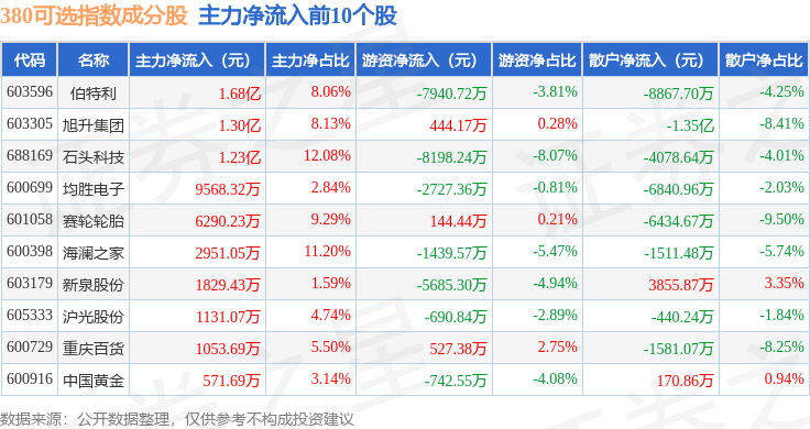 资金流向方面,380可选(000107)指数成份股当日主力资金净流入合计4.31亿元,游资资金净流出合计1.94亿元,散户资金净流出合计2.37亿元。成份股资金流向详情见下表: