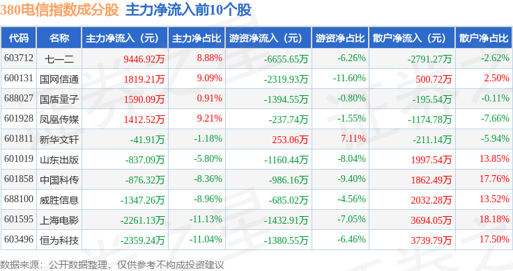资金流向方面,380电信(000112)指数成份股当日主力资金净流出合计21.91亿元,游资资金净流入合计4.17亿元,散户资金净流入合计17.74亿元。成份股资金流向详情见下表: