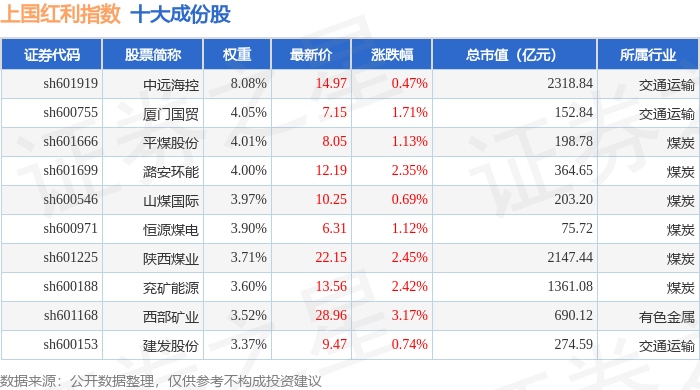 证券之星消息,1月6日,上国红利(000151)指数报收于1544.38点,涨1.05%,成交229.82亿元,换手率0.38%。当日该指数成份股中,上涨的有25家,西部矿业以3.17%的涨幅领涨,下跌的有5家,上海银行以1.68%的跌幅领跌。